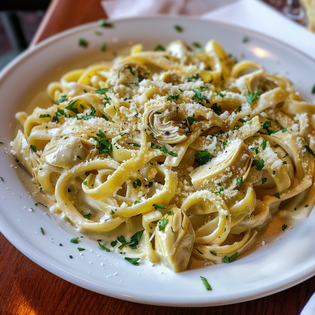 Нежные кусочки артишоков придают пасте уникальный аромат и текстуру, а сливочный соус с добавлением тертого сыра (пармезан или пекорино) обеспечивает насыщенный и глубокий вкус. Сливочное масло и чеснок добавляют блюду дополнительную ароматную ноту, делая его особенно аппетитным. Немного лимонного сока придает свежести и баланса.