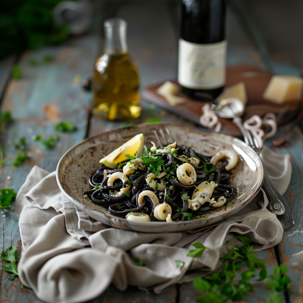 Паста с кальмарами и чернилами – это блюдо, которое перенесет вас на побережье Средиземного моря. Нежная паста, окрашенная чернилами кальмаров в насыщенный черный цвет, прекрасно сочетается с мягкими и сочными кусочками кальмаров. Каждая вилка этой пасты дарит изысканный вкус моря, дополненный легкими нотками чеснока и свежего оливкового масла.