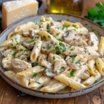 - Подавайте пенне с курицей и грибами горячими, посыпав тертым пармезаном и украшая свежим тимьяном или петрушкой.