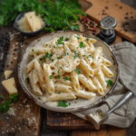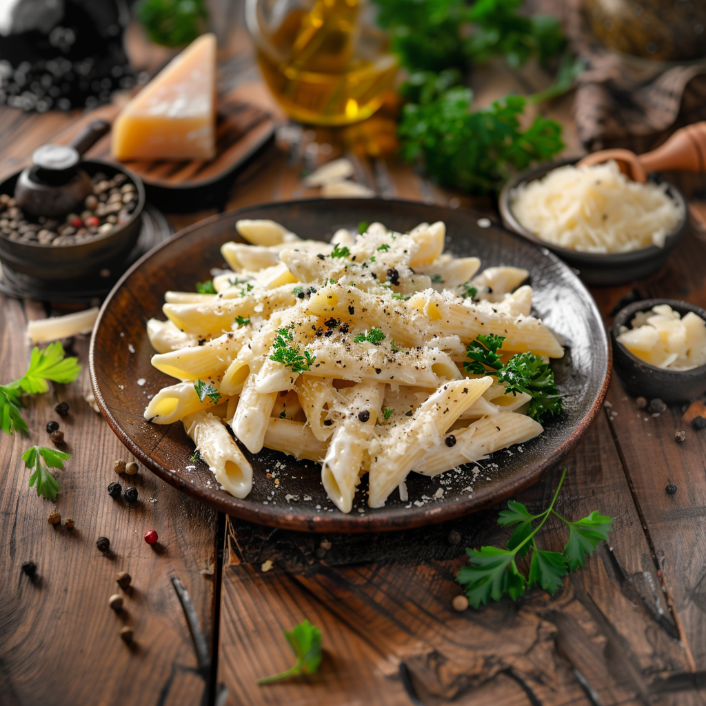 Пенне с сыром пекорино и черным перцем – это классическое итальянское блюдо, простое, но невероятно вкусное. Короткая трубчатая паста пенне идеально удерживает нежный, сливочный соус, который готовится из тертого сыра пекорино и свежемолотого черного перца. Это блюдо, известное как «Качо э пепе,» удивляет своим богатым и насыщенным вкусом, несмотря на минимальное количество ингредиентов. Пекорино придает соусу пикантность и насыщенность, а черный перец добавляет легкую остроту и глубину аромата. Приготовление занимает всего 30 минут, что делает пенне с пекорино и черным перцем идеальным выбором для быстрого, но элегантного ужина. Это блюдо не только вкусно, но и питательно, благодаря высококачественным ингредиентам, которые подчеркивают всю красоту итальянской кухни.