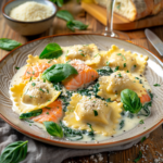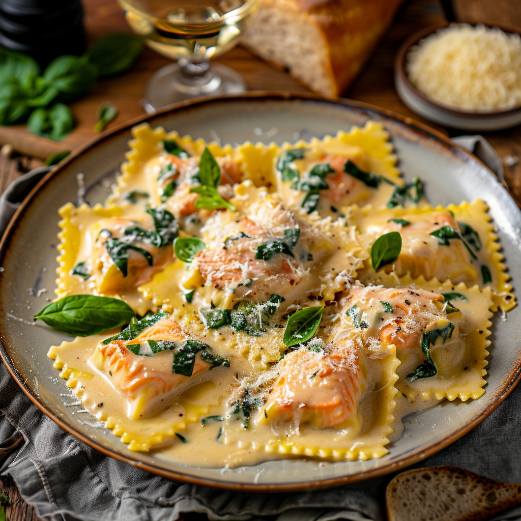 Краткое описание:** Равиоли с лососем и шпинатом — это изысканное и вкусное блюдо итальянской кухни, которое сочетает в себе нежный лосось, свежий шпинат и кремовый соус. Домашнее тесто для равиоли и ароматная начинка делают это блюдо настоящим кулинарным шедевром.