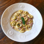 - После того, как тортеллини будут готовы, откиньте их на дуршлаг, а затем добавьте в сковороду к ветчине и чесноку. Тщательно перемешайте.