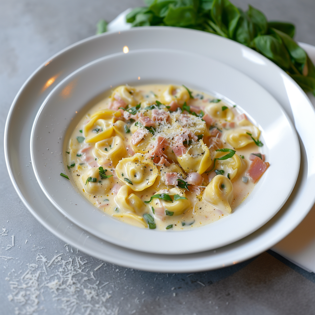 Тортеллини с ветчиной и сыром – это восхитительное и уютное блюдо, которое принесет радость на ваш стол. Нежные тортеллини, наполненные ароматной ветчиной и плавленым сыром, создают идеальное сочетание вкусов. Эти маленькие паста-кольца обжариваются с чесноком и луком, а затем заливаются сливочным соусом, приготовленным из густых сливок, тертого пармезана и щепотки мускатного ореха для дополнительной пикантности. Соус обволакивает каждую тортеллини, делая блюдо невероятно нежным и вкусным. Сверху блюдо посыпается свежим базиликом и еще немного тертым пармезаном, добавляя свежесть и изысканность. Это блюдо идеально подходит для семейного ужина или особого случая, когда хочется насладиться чем-то действительно вкусным и насыщенным.
